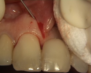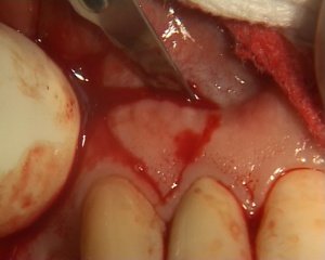 Supression d'un frein entre 11 et 21. Afin d'obtenir un meilleur rendu esthétique, un greffon est prélevé au niveau de la gencive vestibulaire, entre 12 et 13 et mis en place sur le site receveur.
