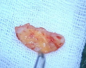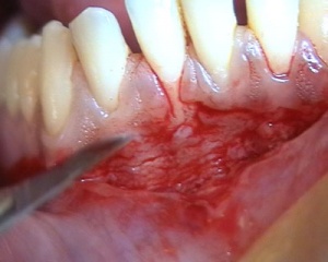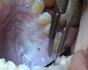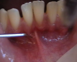 Patient présentant une récession gingivale au niveau d'une incisive mandibulaire qui est dûe à l'insertion haute du frein